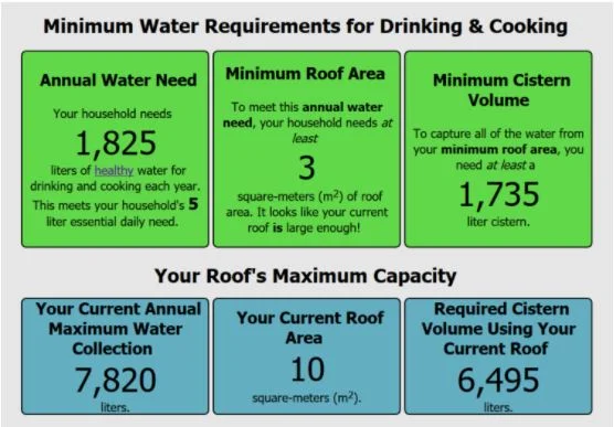 The results tell you how much water your current house can collect and how to store it. It also calculates the minimum roof area and cistern size your household would need to meet its essential water need (the amount required for drinking and cooking every day, during an average year). Just remember, although rainwater is free of almost all contaminants, you still need to treat the biological contaminants (bacteria, viruses, etc.) for it to be safe!