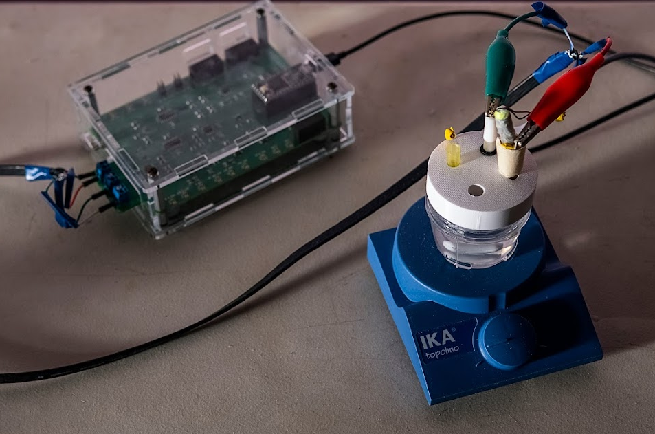 El equipo de prueba de arsénico en el laboratorio de Caminos de Agua. Al lado derecho el envase con la muestra se encuentra encima de un plato de agitación magnética y contiene tres electrodos sostenidos por un recipiente hecho a la medida. Un cable negro conecta dichos electrodos al potenciostato Rodeostat que se ve en el fondo de la foto y que está conectado a una computadora por otro cable de USB (que no aparece en la foto).